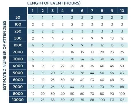 Determine how many hours your event will last. If multiple days, use the longest day. Determine your guest count. If multiple days, use the day with the largest attendance. Use the chart to determine the number of restrooms needed for your upcoming event.