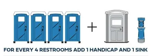Note: If alcohol is being served, add 15-20% more restrooms. Add one Wheelchair Accessible Restroom per 20 portable restrooms, or a minimum of one for events open to the public. Adequate hand washing should also be provided with restrooms in all food service areas. Please know that 1 portable toilet can accommodate 10 workers during a 40-hour work week. More cleanings may be required.